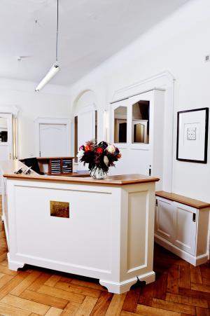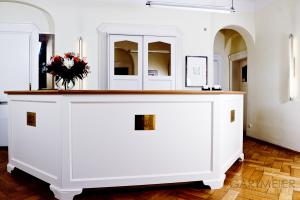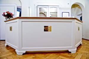 „Empfang Zahnpraxis“, mit einer weiß lackierten Empfangstheke und mit einer Schreibtischplatte und einem Sockel aus Eiche. Der Aktenschrank wurde ebenfalls weiß lackiert.